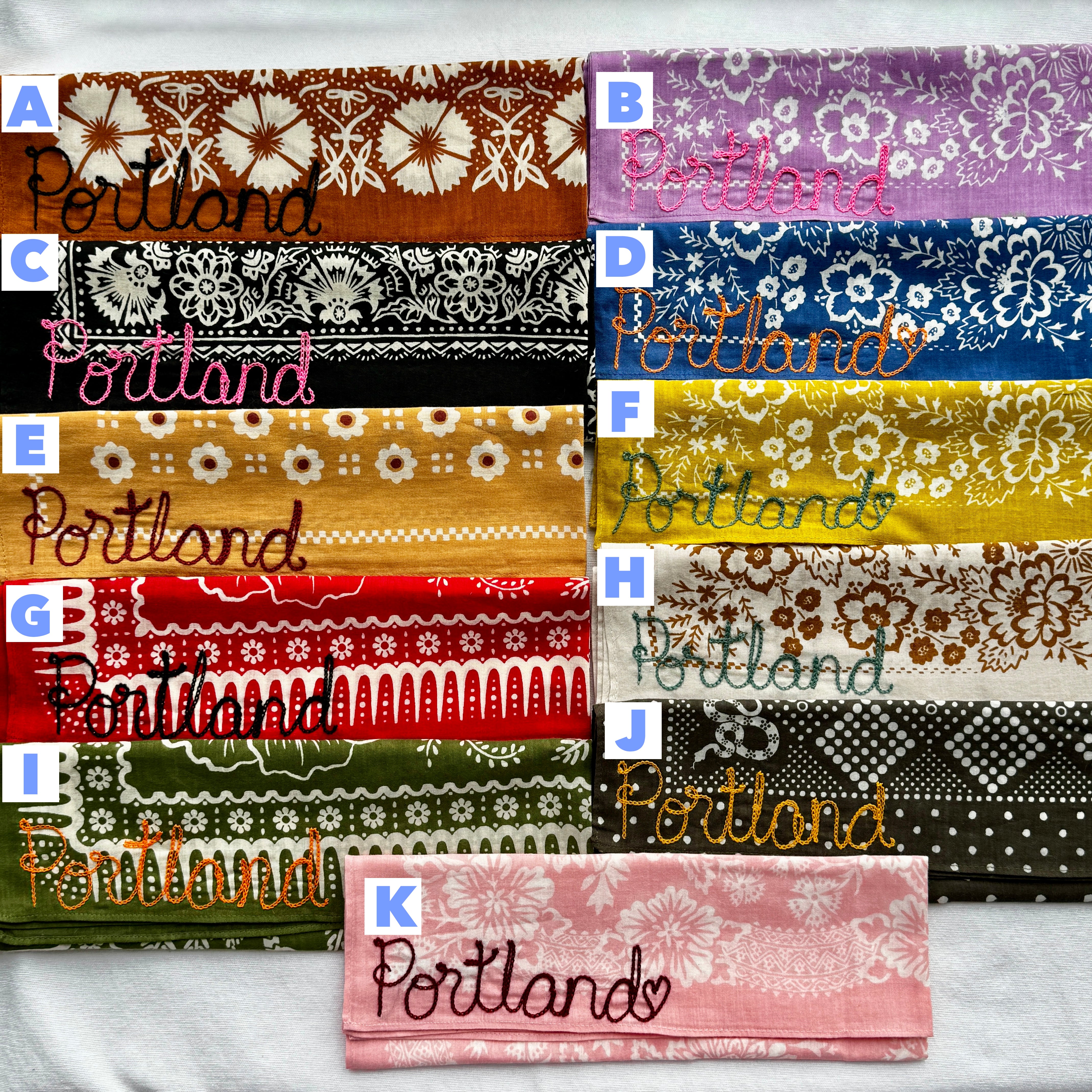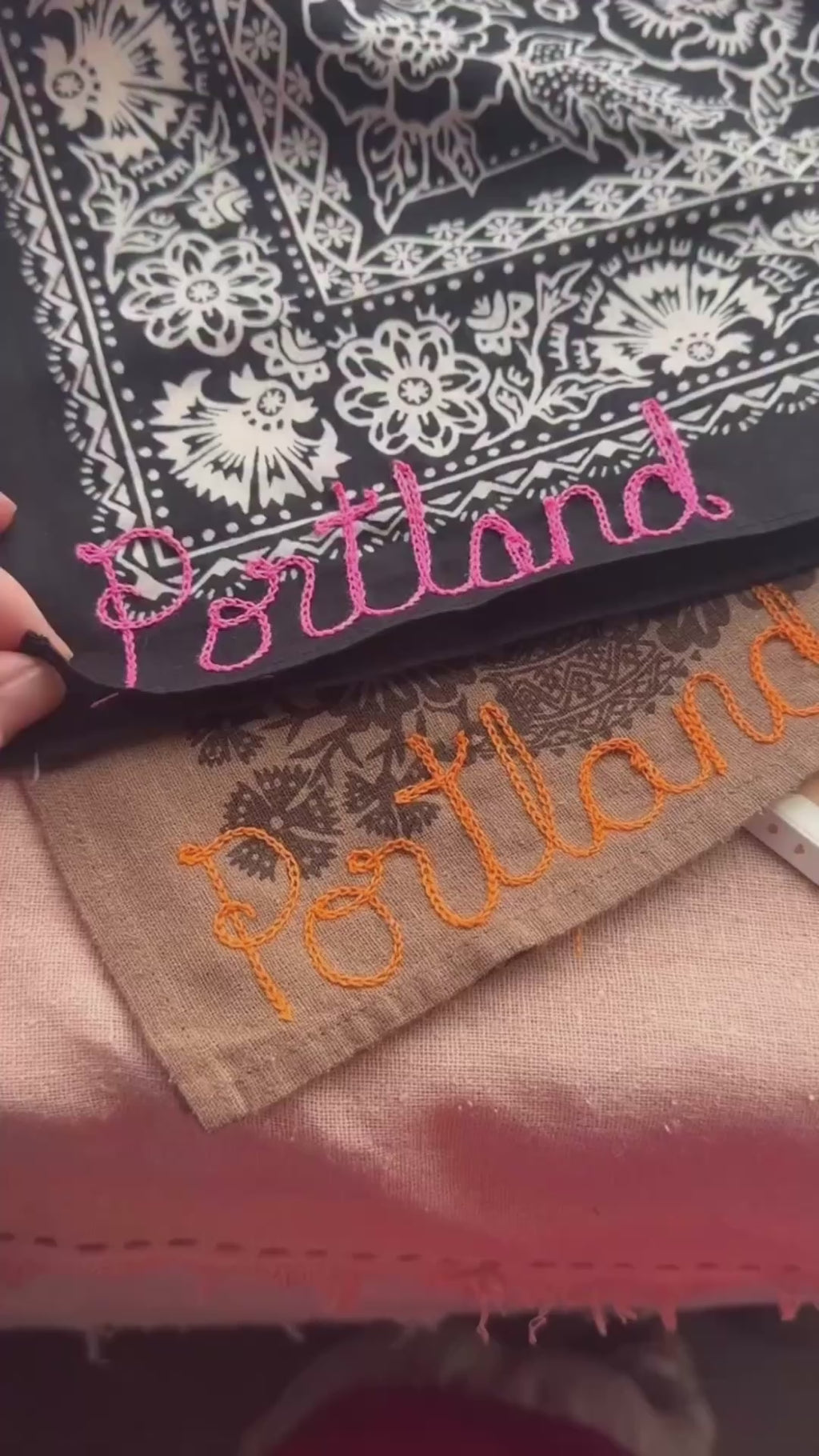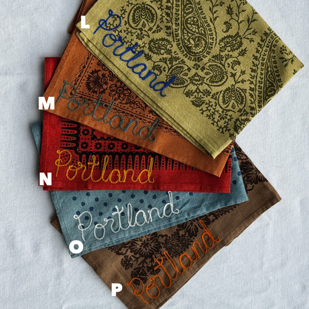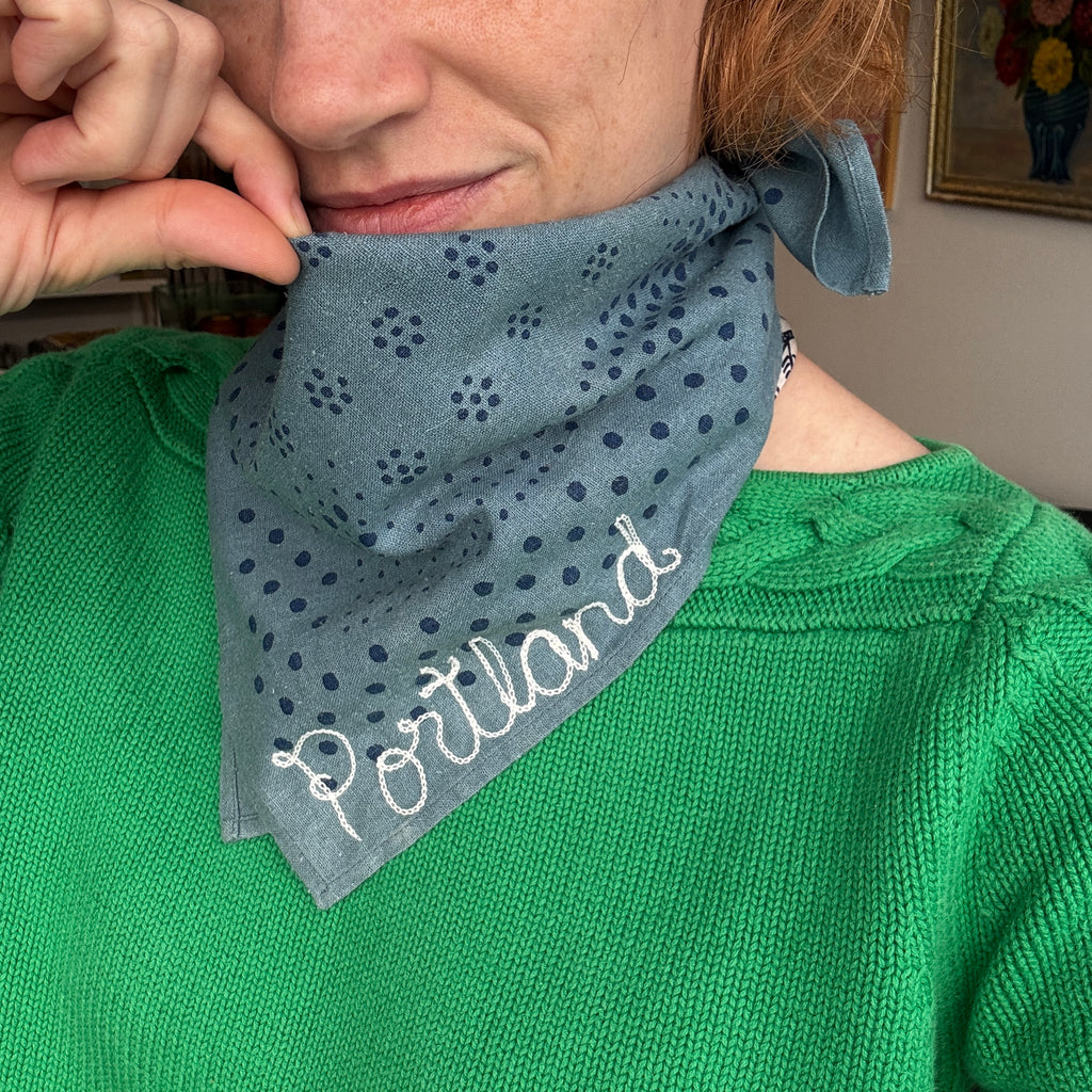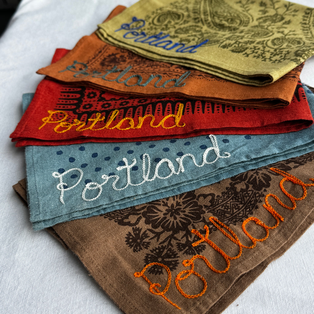 Near our big studio window that overlooks Portland's Central Eastside, we saddled up to our chainstitch machine and whipped up some favorite bandanas with a touch of Portland love.