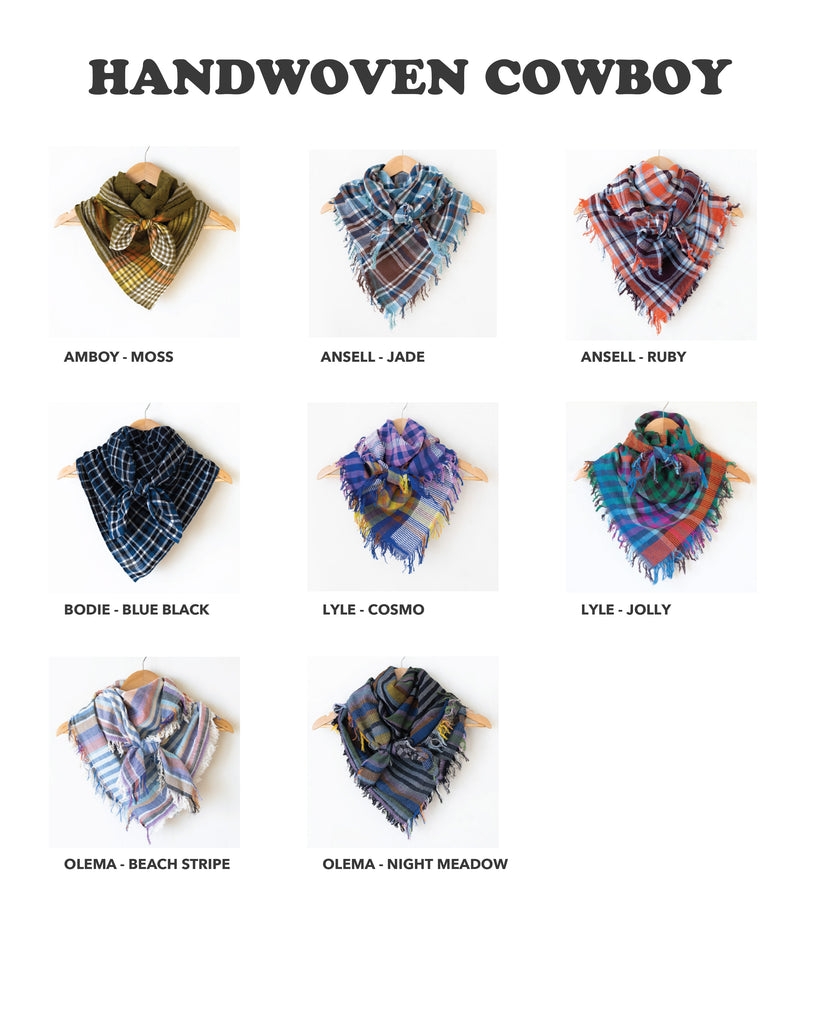Use the drop-down menus to choose any three regularly priced LCT Signature Cowboy Scarves (ONE HONCHO + ONE HANDWOVEN + ONE LIGHT SILK). See product photos for a quick reference thumbnail