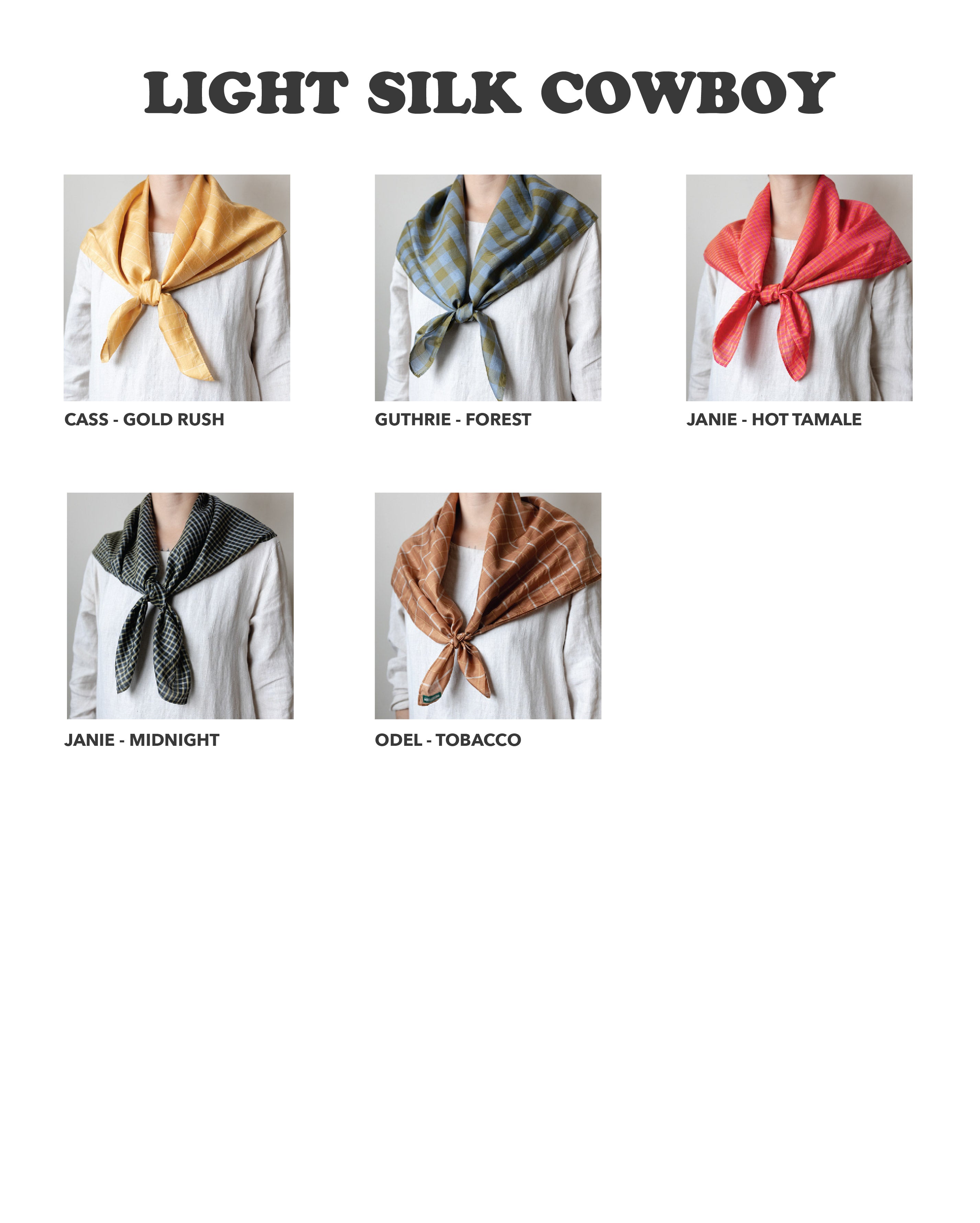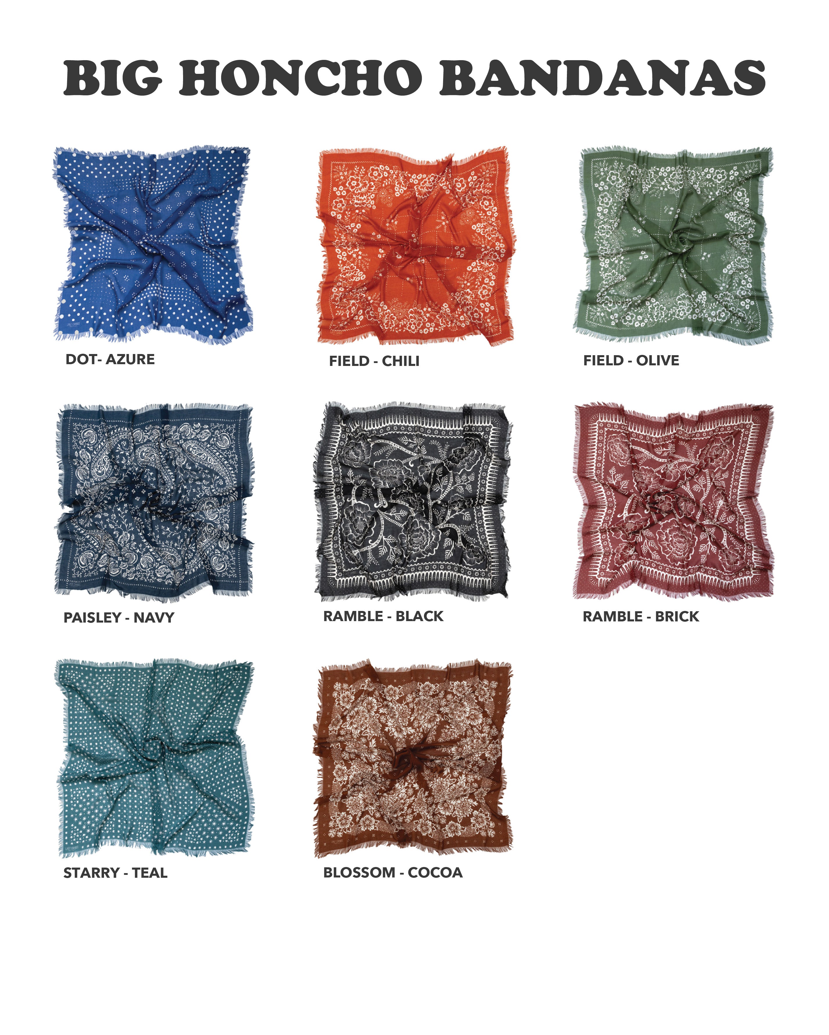 The Honcho is a big lightweight bandana you didn't know you needed! The Handwoven styled with a buckaroo knot is classic. And The Light Silk is luxury and durability woven into an unassuming scarf.