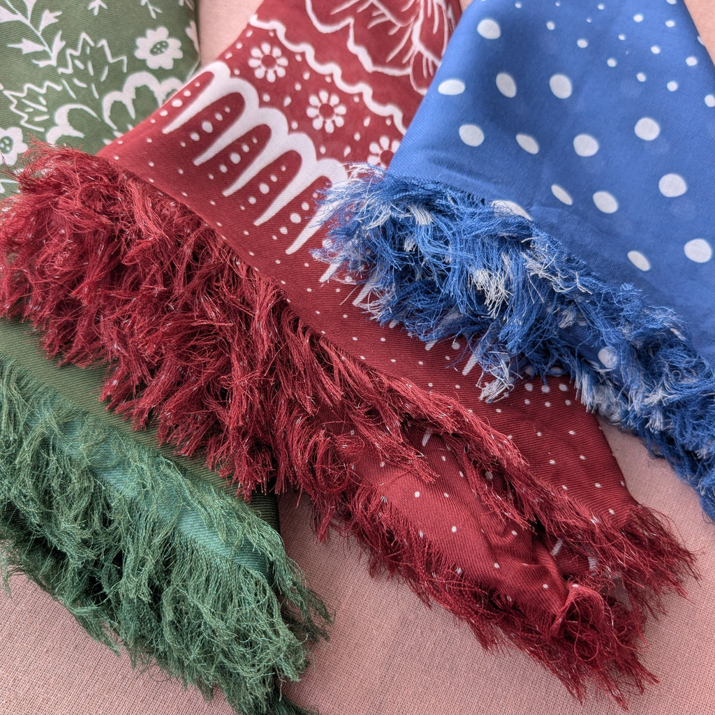 [{"id":262868533429,"handle":"artisan-collaboration","title":"Artisan Collaboration","updated_at":"2025-11-15T04:10:52-08:00","body_html":"\u003cp\u003eOur collaborations range from Texas to India and take place in smaller workshops.\u003c\/p\u003e\n\u003cp\u003eWhen working abroad we connect directly with the artisans, work with NGOs such as \u003ca href=\"https:\/\/lastchancetextiles.com\/collections\/handwoven-scarves\" target=\"_blank\"\u003eWomenWeave\u003c\/a\u003e, or use well-vetted local heritage arts experts to aid in projects and communications. The artisans set the price and we don't push back. Our expert partners are paid for their consultation separately. In other words, no middlemen.\u003c\/p\u003e","published_at":"2021-03-21T15:45:06-07:00","sort_order":"best-selling","template_suffix":"","disjunctive":false,"rules":[{"column":"tag","relation":"equals","condition":"Artisan Collaboration"}],"published_scope":"global","image":{"created_at":"2023-01-10T23:26:20-08:00","alt":null,"width":2588,"height":2588,"src":"\/\/lastchancetextiles.com\/cdn\/shop\/collections\/PB090008.jpg?v=1673422132"}},{"id":262866632885,"handle":"shop-bandanas-scarves","title":"Bandanas + Scarves","updated_at":"2025-11-16T04:08:33-08:00","body_html":"","published_at":"2021-03-21T15:24:23-07:00","sort_order":"best-selling","template_suffix":"","disjunctive":true,"rules":[{"column":"tag","relation":"equals","condition":"Scarves"},{"column":"tag","relation":"equals","condition":"Bandanas"},{"column":"tag","relation":"equals","condition":"Slides"}],"published_scope":"global"},{"id":452656333015,"handle":"bigger-bandanas","title":"Bigger Bandanas","updated_at":"2025-11-15T04:10:52-08:00","body_html":"\u003cp style=\"text-align: center;\"\u003e\u003cstrong data-start=\"110\" data-end=\"149\"\u003eGo big with our oversized bandanas!\u003c\/strong\u003e\u003c\/p\u003e\n\u003cp style=\"text-align: center;\"\u003e\u003cbr data-start=\"149\" data-end=\"152\"\u003eThe dainty details you know and love bloom into full flower power at this larger scale. More coverage, more ways to style, and the same timeless charm of classic bandana patterns.\u003c\/p\u003e","published_at":"2025-03-05T19:59:34-08:00","sort_order":"manual","template_suffix":"","disjunctive":false,"rules":[{"column":"tag","relation":"equals","condition":"Big Bandana 28\" to 34\""}],"published_scope":"global","image":{"created_at":"2025-03-05T19:59:33-08:00","alt":null,"width":2048,"height":2048,"src":"\/\/lastchancetextiles.com\/cdn\/shop\/collections\/IMG_3326.jpg?v=1757618152"}},{"id":411817967831,"handle":"bundle-and-save","title":"Bundle and Save","updated_at":"2025-11-13T11:26:54-08:00","body_html":"","published_at":"2022-12-05T22:29:02-08:00","sort_order":"best-selling","template_suffix":"","disjunctive":true,"rules":[{"column":"title","relation":"contains","condition":"bundle"},{"column":"title","relation":"contains","condition":"combo"}],"published_scope":"global","image":{"created_at":"2024-01-30T15:09:23-08:00","alt":null,"width":1800,"height":1200,"src":"\/\/lastchancetextiles.com\/cdn\/shop\/collections\/8E4A6805.jpg?v=1712623198"}},{"id":262867484853,"handle":"cotton-bandanas","title":"Cotton Bandanas","updated_at":"2025-11-16T04:08:33-08:00","body_html":"\u003cp\u003eEvery bandana features an original hand-drawn pattern by our founder Lindsey Fout. We make each bandana from scratch using high-quality and sustainable fabrics. We work in small batches to cut, sew, custom dye, and screen-print each piece! \u003cstrong\u003e\u003cbr\u003e\u003c\/strong\u003e\u003c\/p\u003e\n\u003cp\u003e\u003cstrong\u003eAbout the COTTON BANDANAS: \u003c\/strong\u003eWe're now using a very soft cotton voile with full saturation printing, which shows on both sides! This cotton is a tad lighter but still strong due to a mercerizing process that strengthens the fibers and makes them more absorbent. \u003cspan style=\"font-weight: 400;\" data-mce-fragment=\"1\" data-mce-style=\"font-weight: 400;\"\u003e Organic cotton is grown free from pesticides and uses less water than conventional cotton. GOTS is the global leader in organic standards. Its certifications cover the growing process and supply chain, including social and labor criteria. GOTS Certified means doing better for the earth, workers, and consumers. \u003c\/span\u003eRead more about our new and improved cotton bandanas \u003ca href=\"https:\/\/lastchancetextiles.com\/blogs\/news\/the-ideal-bandana-what-s-mine-is-yours\" data-mce-fragment=\"1\" data-mce-href=\"https:\/\/lastchancetextiles.com\/blogs\/news\/the-ideal-bandana-what-s-mine-is-yours\" target=\"_blank\"\u003ehere\u003c\/a\u003e.\u003cem data-mce-fragment=\"1\"\u003e \u003c\/em\u003e\u003c\/p\u003e","published_at":"2021-03-21T15:36:27-07:00","sort_order":"manual","template_suffix":"","disjunctive":false,"rules":[{"column":"tag","relation":"equals","condition":"Bandanas"},{"column":"tag","relation":"equals","condition":"Cotton"},{"column":"title","relation":"not_contains","condition":"IMPERFECT"}],"published_scope":"global","image":{"created_at":"2023-01-04T15:18:03-08:00","alt":null,"width":1600,"height":1067,"src":"\/\/lastchancetextiles.com\/cdn\/shop\/collections\/IMG_2917_3_600x600_0734d9c7-f3d0-4011-87a7-b50e6b2278bf.webp?v=1681173395"}},{"id":430088487127,"handle":"handwoven-cowboy-scarves","title":"Cowboy Scarves","updated_at":"2025-11-15T04:10:52-08:00","body_html":"","published_at":"2024-04-24T20:07:47-07:00","sort_order":"alpha-desc","template_suffix":"","disjunctive":false,"rules":[{"column":"tag","relation":"equals","condition":"Cowboy Scarf 36\" to 48\""},{"column":"tag","relation":"equals","condition":"Handwoven"},{"column":"title","relation":"not_contains","condition":"Silk Twill"}],"published_scope":"global"},{"id":395264164055,"handle":"gift-guide","title":"Gift Guide","updated_at":"2025-11-16T04:08:33-08:00","body_html":"\u003ch4 style=\"text-align: center;\"\u003eGifting on a budget? Or looking to splurge on someone special