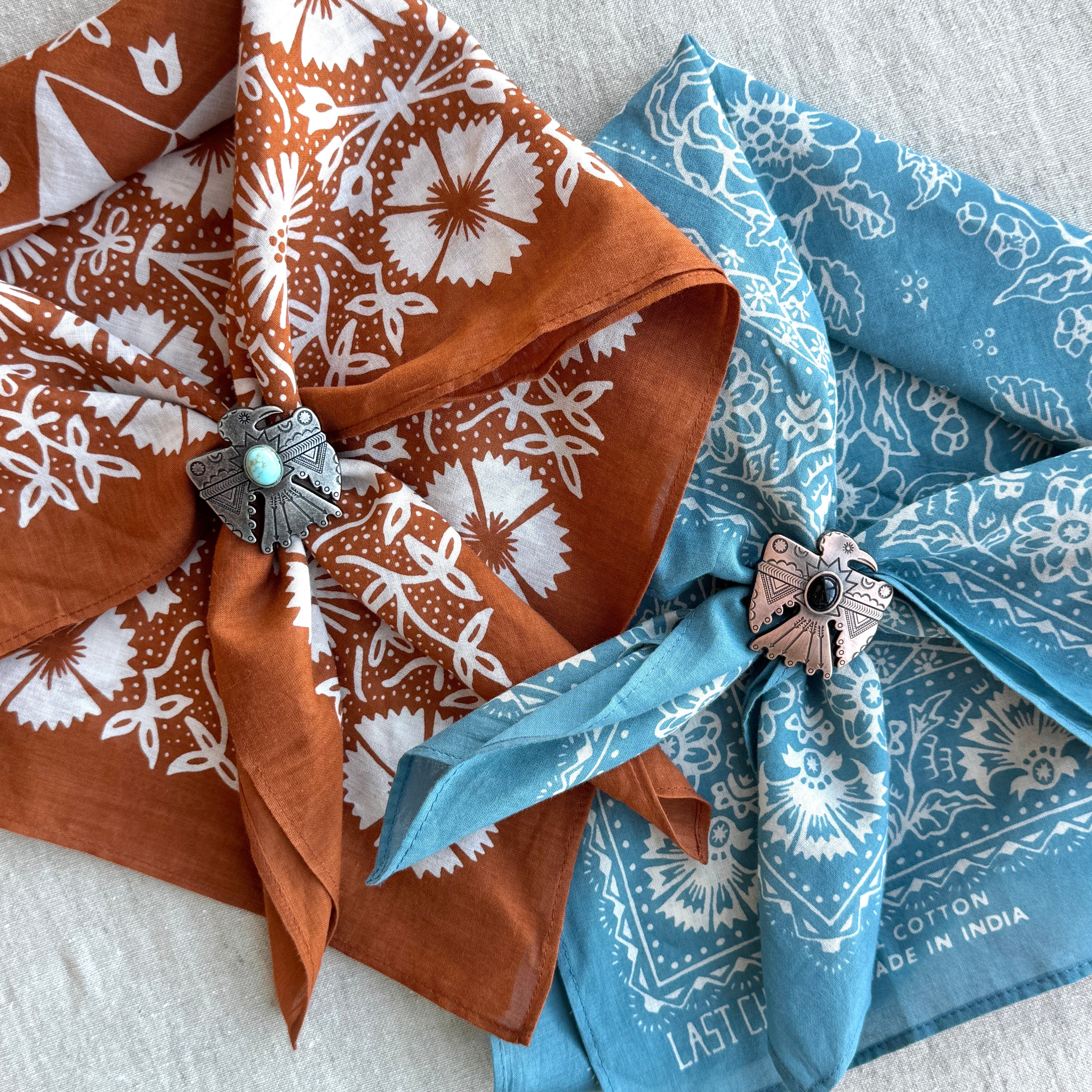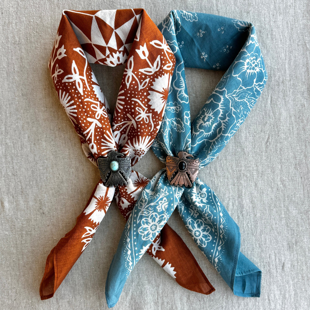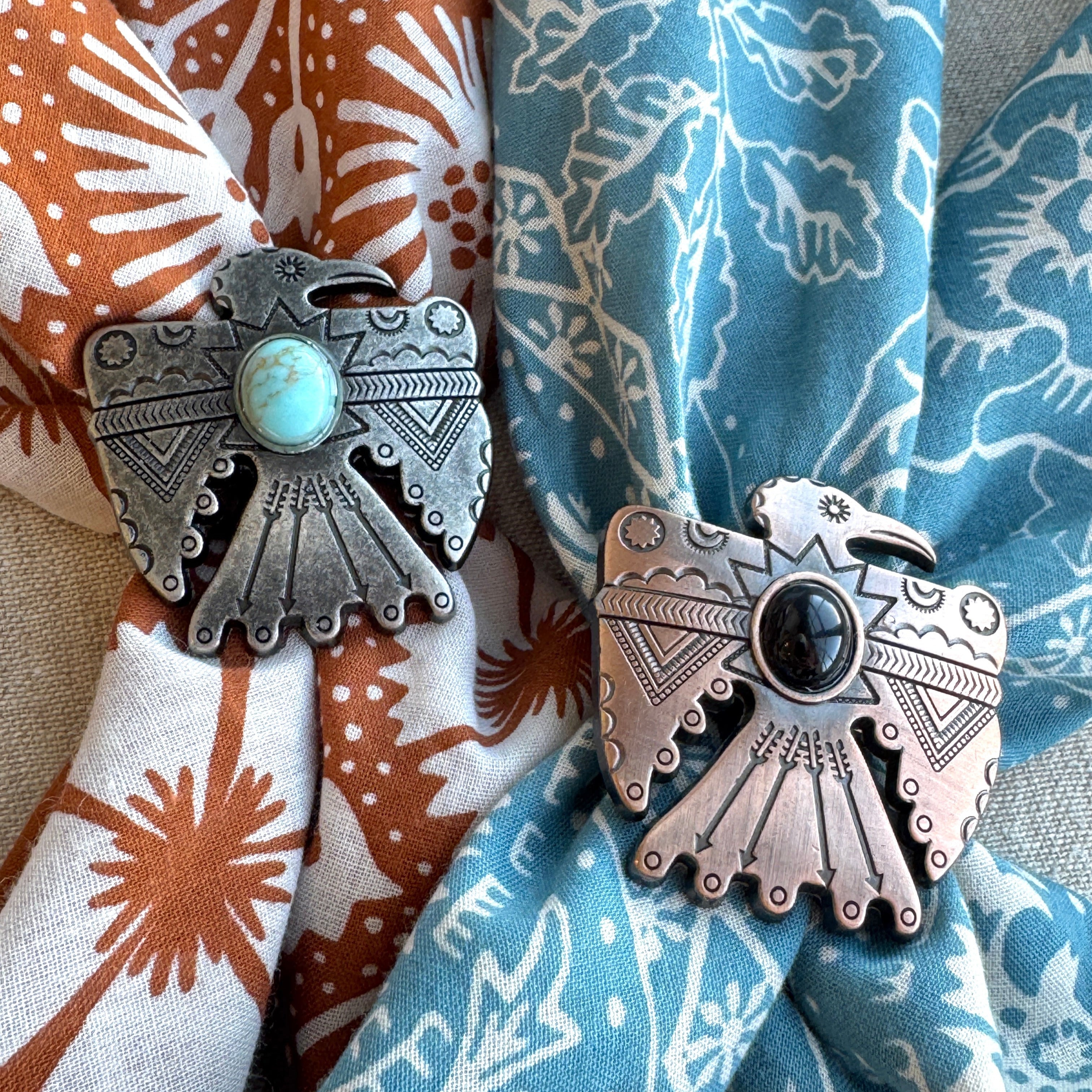 Dress up your bandana or scarf with a thunderbird symbolizing power, protection and strength! The back has narrow loop to hold a large scarf securely. To fasten onto a thinner scarf or bandana, just loop one end through twice to secure.