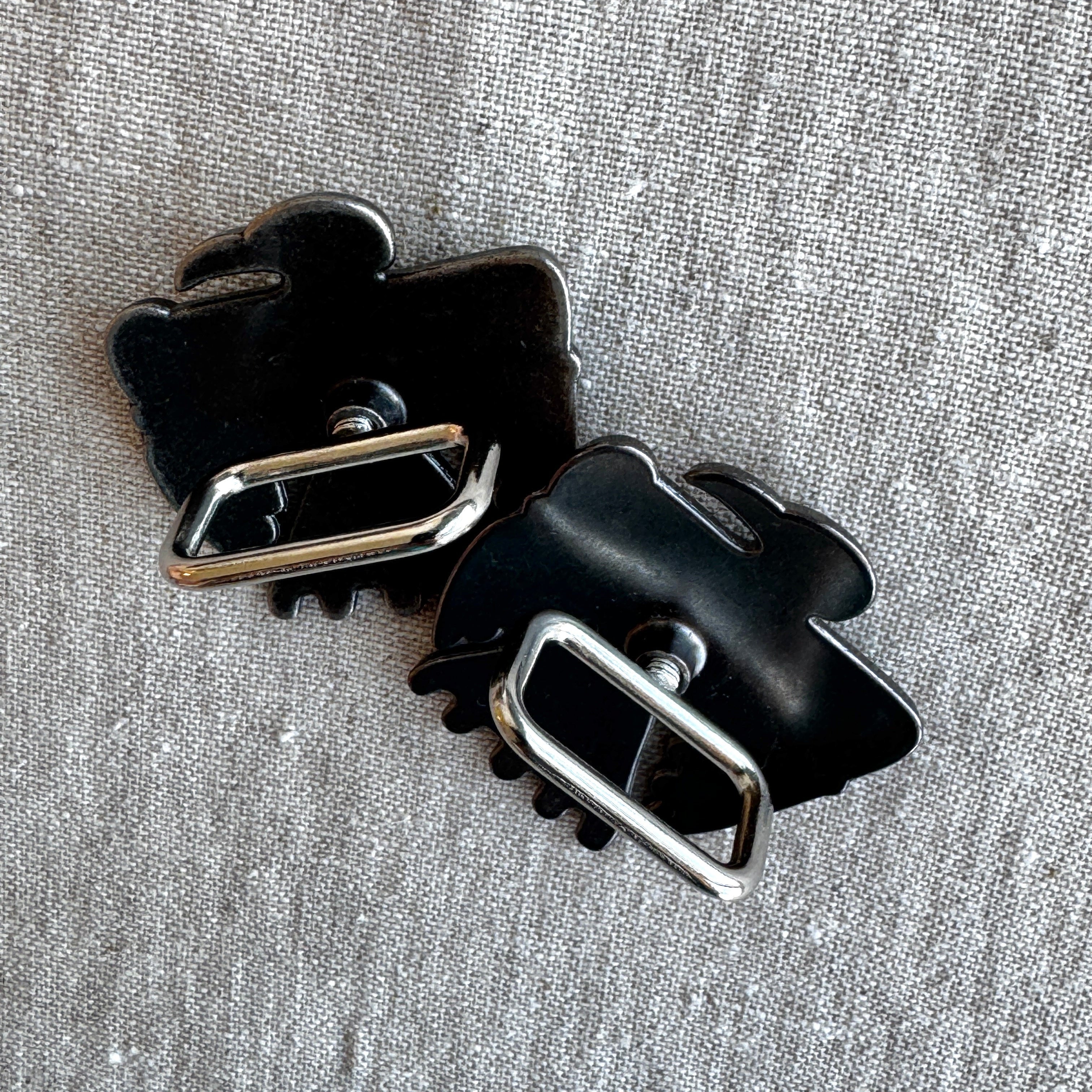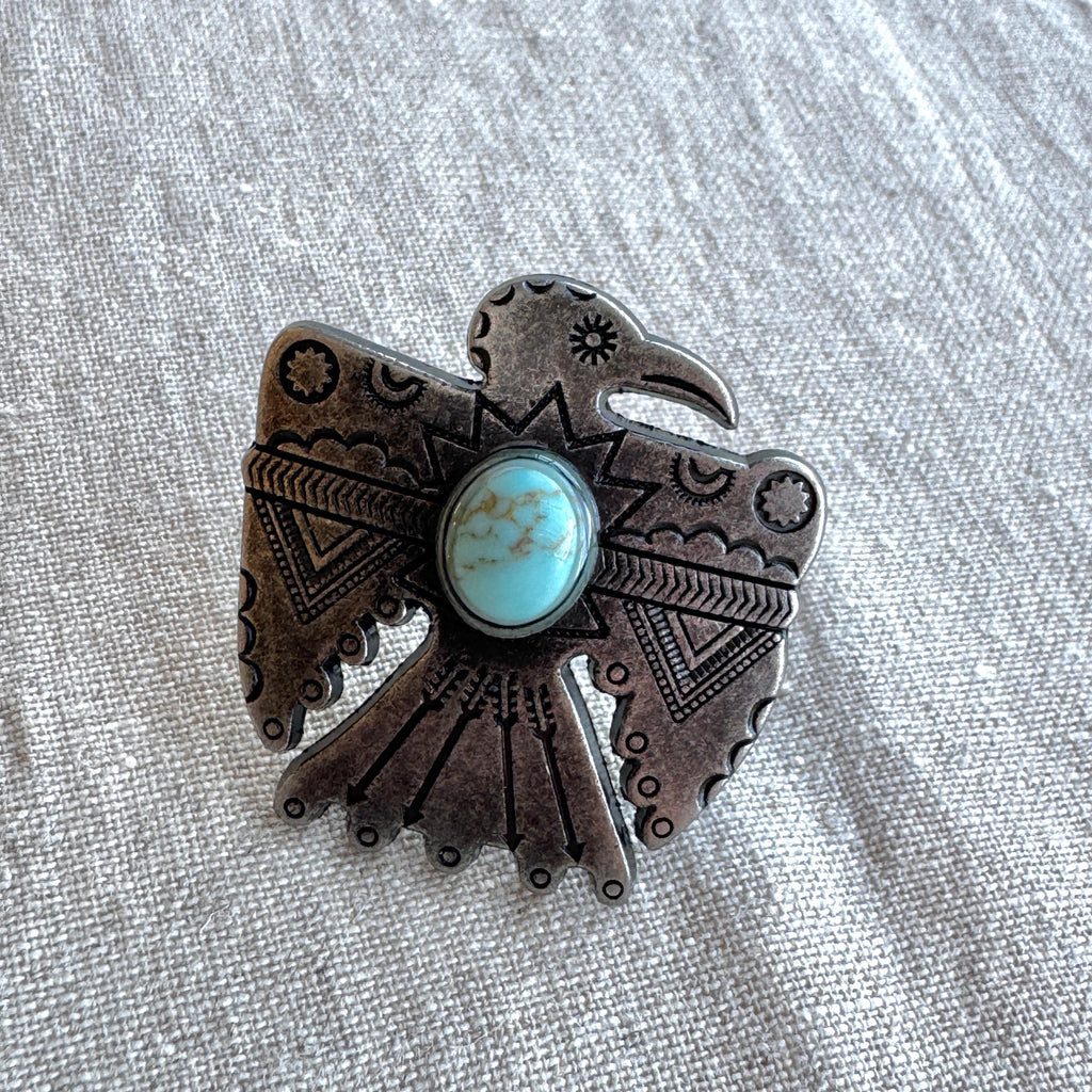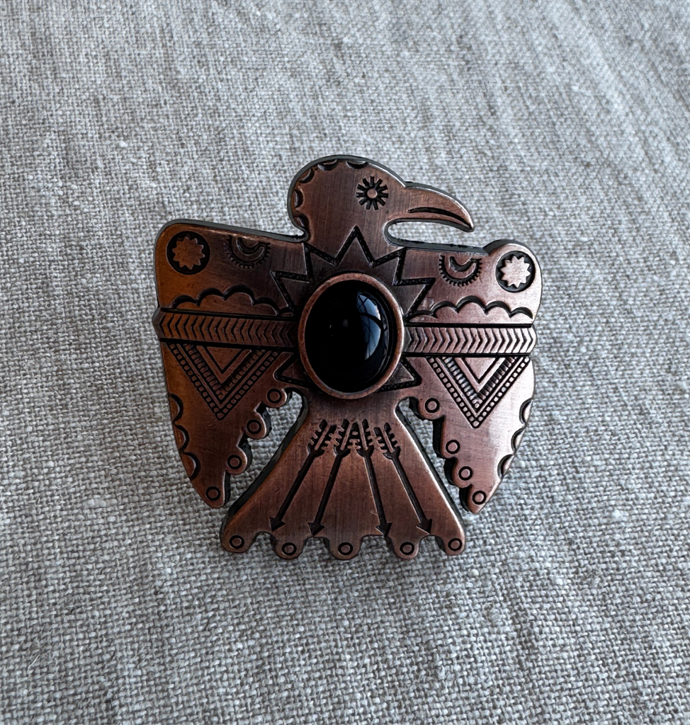 Dress up your bandana or scarf with a thunderbird symbolizing power, protection and strength! The back has narrow loop to hold a large scarf securely. To fasten onto a thinner scarf or bandana, just loop one end through twice to secure.