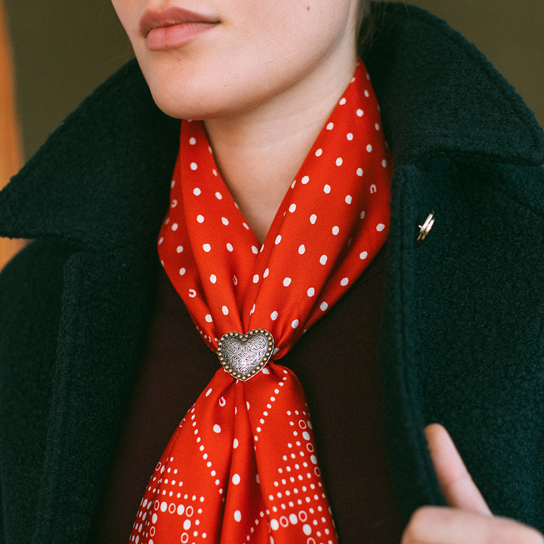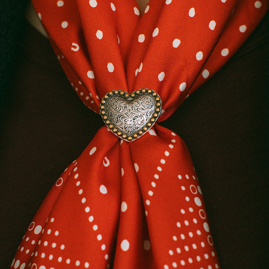 Dress up your bandana or scarf with a traditional western-wear concho! The back has narrow loop to hold a large scarf securely. To fasten onto a thinner scarf or bandana, just loop one end through twice to secure.