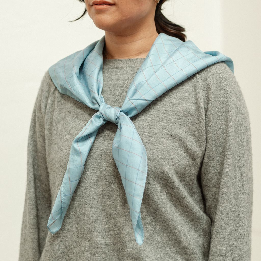 Strut the range in style with Cass Handwoven Cowboy Scarf! A classic grid with a subtle dark blue and brick red stripe on a warm sky blue ground. The featherweight silk has a subtle, lustrous shine and a beautifully 'lived-in' texture that feels great against the skin.