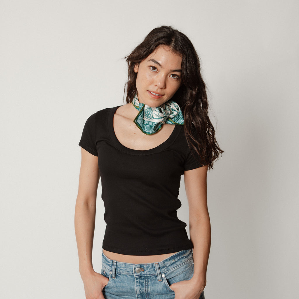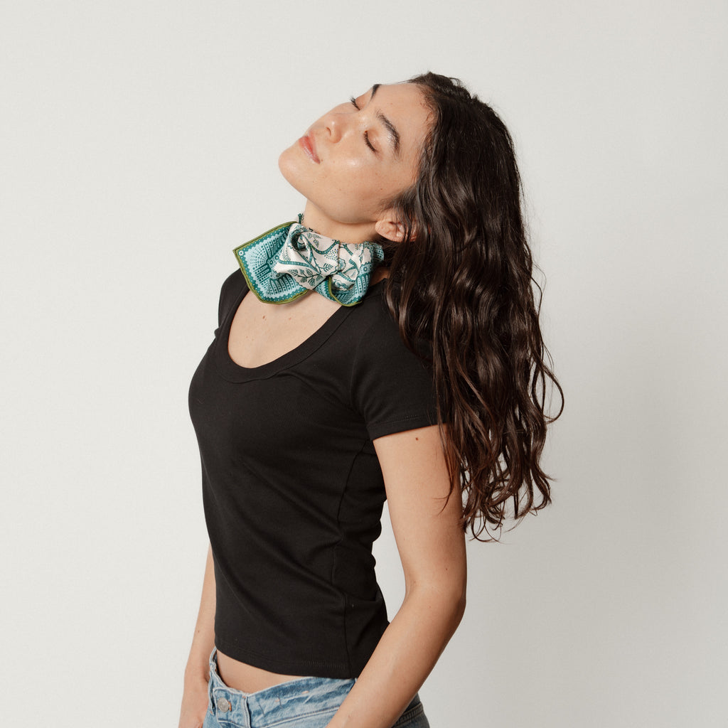 The small 19" size is a petite neckerchief that can be styled in all the same ways as our signature cotton and silk bandanas. It makes a great pop of color to go with your basics.