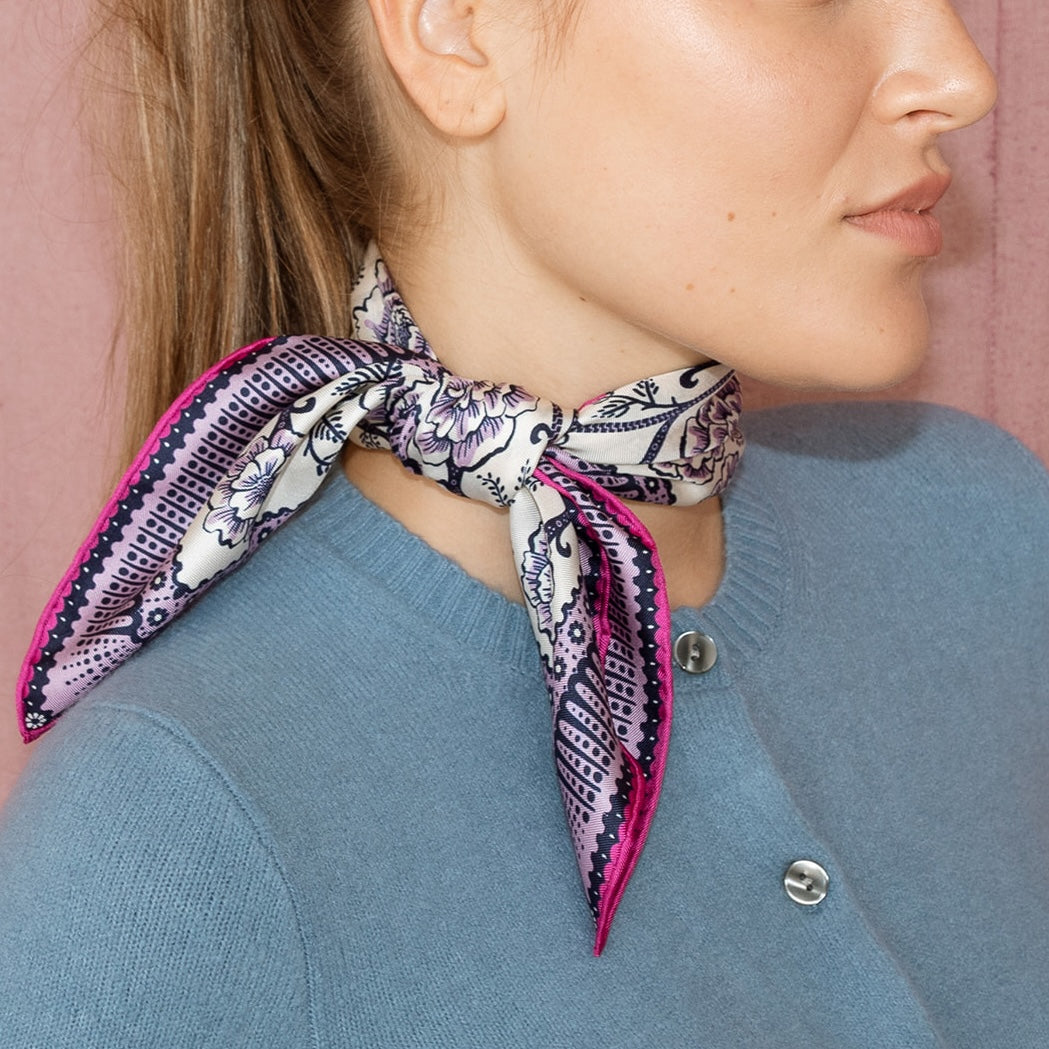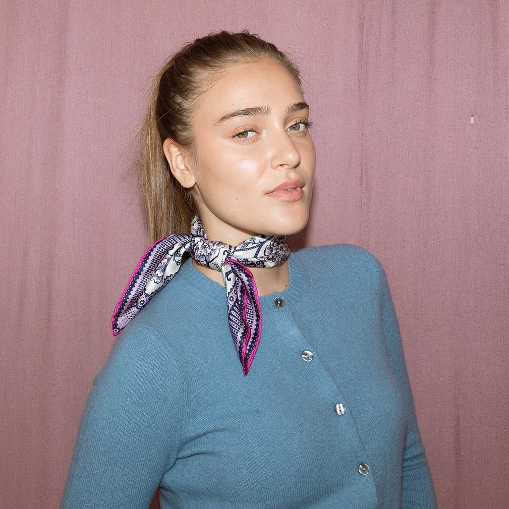 The small 19" size is a petite neckerchief that can be styled in all the same ways as our signature cotton and silk bandanas. It makes a great pop of color to go with your basics.