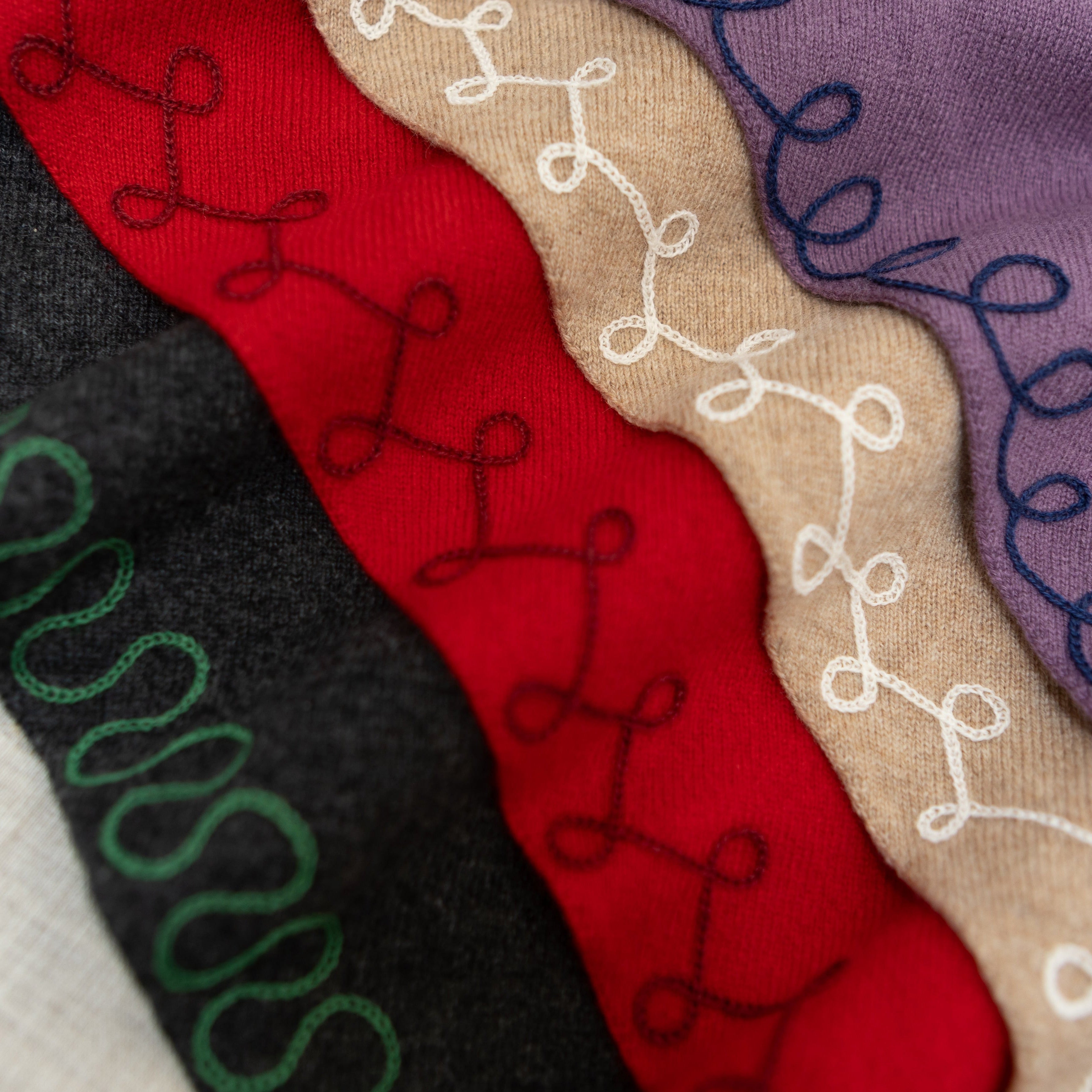 This incredibly soft cashmere is responsibly sourced and meets the Good Cashmere Standard. This cashmere starts its journey in Inner Mongolia where the wool is harvested from the goats, spun and knit, then travels to our Portland, Oregon Studiowhere each piece receives its finishing touch; an embroidered border, stitched one at a time, on a hand operated chainstitch machine.