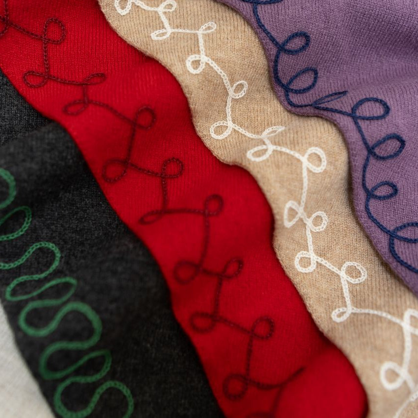 This incredibly soft cashmere is responsibly sourced and meets the Good Cashmere Standard. This cashmere starts its journey in Inner Mongolia where the wool is harvested from the goats, spun and knit, then travels to our Portland, Oregon Studiowhere each piece receives its finishing touch; an embroidered border, stitched one at a time, on a hand operated chainstitch machine.